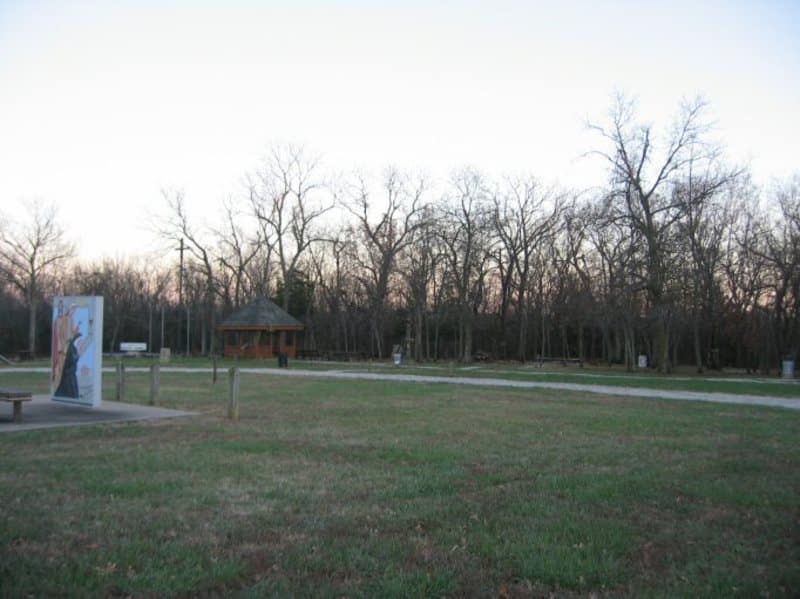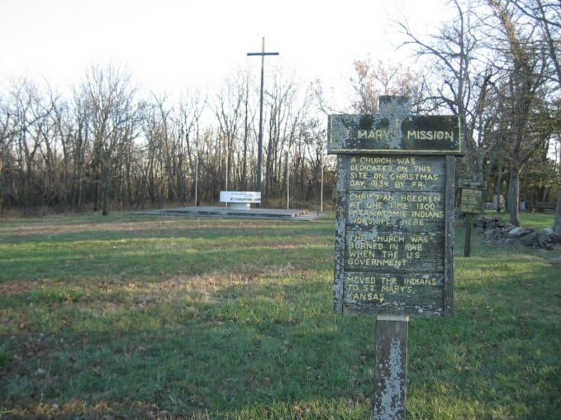 After seeing the shrine, I went out to see the site of the Mission. It’s well off the beaten path about 10 miles from Mound City and even today is in the middle of nowhere. Unfortunately, when the Mission closed in 1849 they felt they had to burn all the buildings to prevent desecration. So, only some stone foundations are left. At the shrine in Mound City the nice ladies of the parish told me that I should come back later because Archbishop Naumann was coming to have dinner and celebrate Mass. What a great surprise! So, I had some time to kill out at the Mission site. I took a hike through the woods and visited all the monuments. As the sun was going down I still had some time and so I sat down on a picnic table right at the spot where the log chapel used to stand and I chanted Evening Prayer.