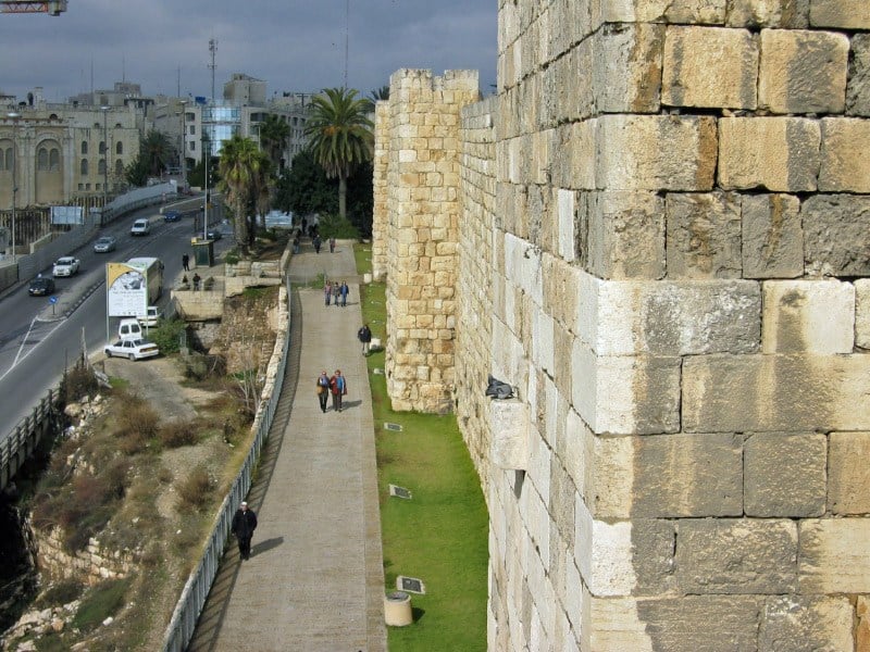 After praying at the Holy Sepulcher for a while and attending mass in Portuguese we decided to see the rest of the city. I believe there are about 600,000 people living in Jerusalem and about 15,000 of those live inside the walls of what is known as the “Old City”. This is the area that is enclosed by the famous walls you always see in pictures. The size and shape of the Old City of Jerusalem has changed many times over the years. Jerusalem has been destroyed and rebuilt so many times that I think even the archeologists have lost count. The present walls were built by Suleyman the Magnificent from 1536-1541.That seems old, but consider that King David build the first walls around 1000 BC. If something isn’t at least a millennium old here then it’s considered new. One of the nice things about these walls is that you can actually get up on the top and walk all around the city. We decided to do this to get an overview of the city. You can’t quite go all the way around because the area near the Temple Mount is closed, but we still walked about 2.5 miles.
