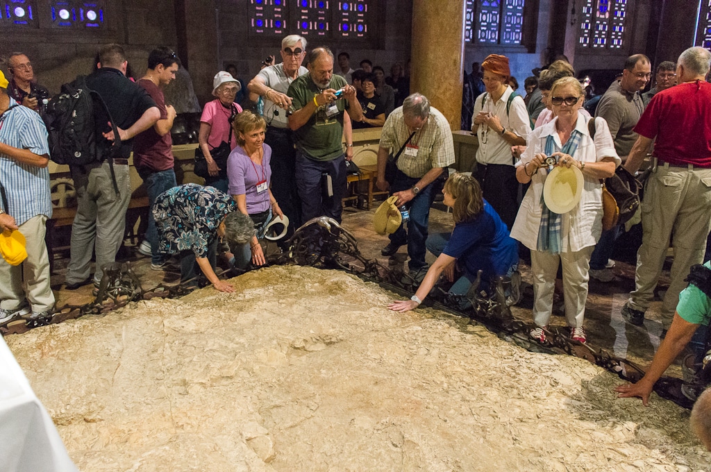 The Church of All Nations (built by donations from all over the world) is built on the site of Jesus’ Agony in the Garden. Outside the church is an enclosed area with olive trees, some of which are 2000 years old and would have been there on that fateful night as silent witnesses to the agony. The central focus inside the church is the Rock of Agony. It was here that Jesus prostrated himself and sweat blood as he courageously made the decision to abandon himself to the Father’s will and undergo his passion. Celebrating Mass at this rock was a very moving experience. Praise Jesus for what he did for our salvation.