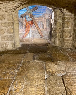 We ended out day with a visit to the Pool of Bethesda where Jesus cured a blind man and then our daily rosary at the place where Jesus was condemned to death by Pilate. The Scriptures call this place Gabatha or “The Stone Pavement.” Archaeologists have found the original first century stones where Jesus would have been on trial. It was a powerful place to pray and think about the pain of Jesus. You can still see carvings in the stones where the Roman soldiers would have played games and mocked prisoners such as Jesus. Being in this place brought me very close to Jesus and the sadness he would have felt being unjustly accused and condemned at that spot. The bloody scourging would have also taken place in this spot. O God, for the sake of his sorrowful passion, have mercy on us and on the whole world.