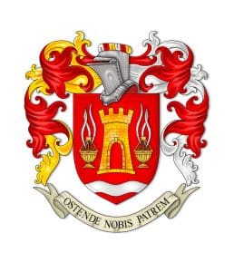 BLAZON: Gules between two thuribles Or with smoke emanating from them Argent, a tower embattled with an open portal composed of twelve stones and a capstone Or; in base a barrulet wavy Argent.
