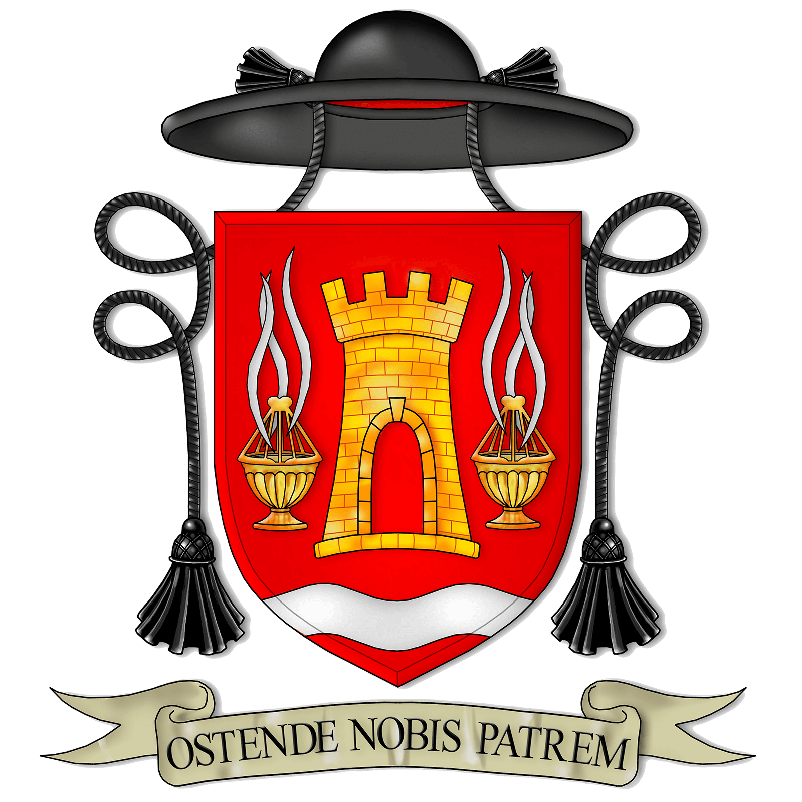 The shield is ensigned with the black galero of a priest, with black cords terminating in two black tassels in accord with the ancient custom of the Church and the decrees of the Holy See. The motto appears below the shield on a scroll saying, “Ostende Nobis Patrem” (show us the Father). This phrase, uttered by St. Philip, expresses the desire to see God and is very meaningful to the bearer as St. Philip is his secondary baptismal patron.