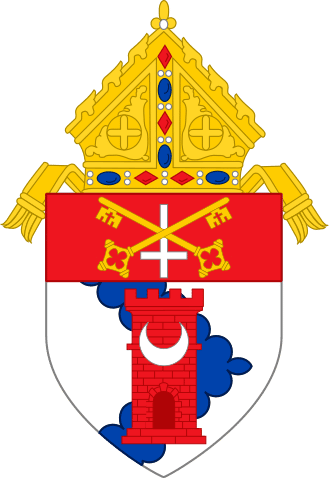 For the elements on the shield (called “charges”) I worked with the artist to create something meaningful and that people might recognize as belonging to me. My first thought was of course to honor my patron St. John the Baptist. For this I thought of a river. It just so happens that the coat of arms for the Archdiocese of Kansas City in Kansas has a river. I therefore decided to borrow the symbols from the archdiocesan arms. This is especially fitting since the tower by the river represents Ft. Leavenworth and I was born in Leavenworth.