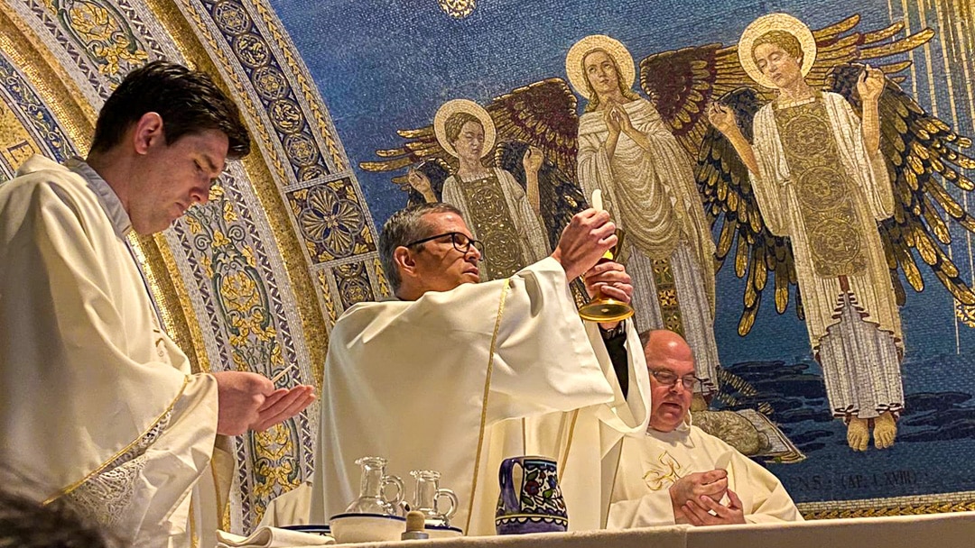 As we celebrated Mass there, I noticed the four mosaics on the vault of the ceiling. It struck me that the point of these images seemed to be to show other ways in which Jesus is revealed. However, each of these manifestations seemed to me to be almost the opposite of the transfiguration. While the transfiguration is the highlight of clarity, the images on the ceiling seem almost to hide more than they reveal. In the homily today I consider how each of these mosaics reveals Jesus.