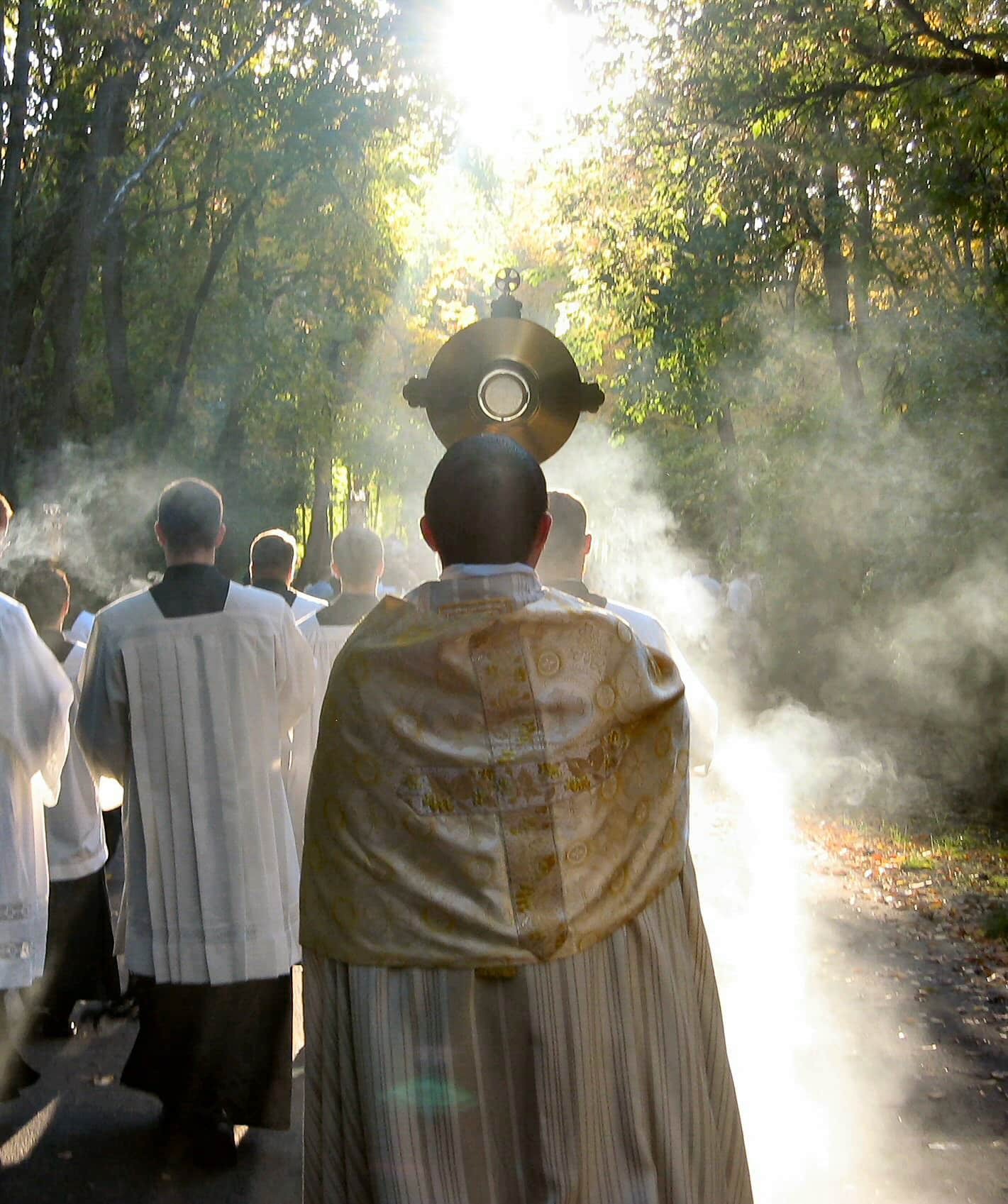 Following is a pictorial pilgrimage with us in our procession. There were several stations along the way where we stopped and gave a blessing. A different deacon composed an original prayer for each station and these are found below with the appropriate picture. In between stations we sang Eucharistic hymns and prayed the Rosary and Chaplet of Divine Mercy. Some of the singing was accompanied by me on trumpet as well as various choir members carrying hand bells. I couldn’t help but remark at the end of all this how truly great it is to be Catholic. Our faith is a very tangible and incarnational faith that involves all the senses. We need the physical movement of the procession, the sound of the bells, and so much incense that the trees will smell all winter. I hope the pictures give you some sense of the experience.
