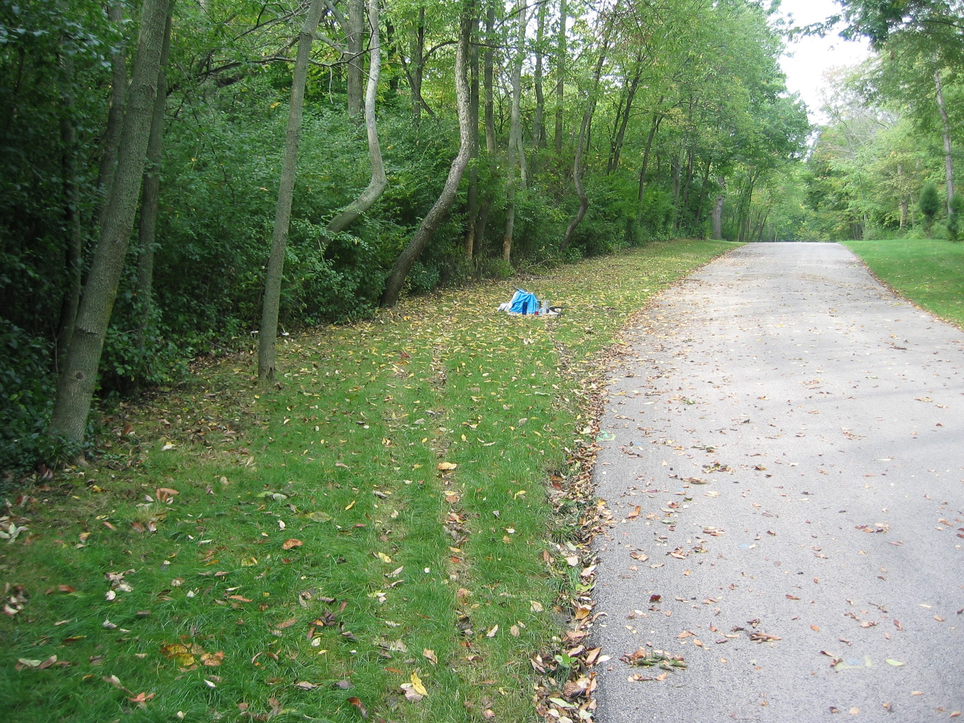 The car veered off the road to the left here. The two visible stripes in the grass were made from the front and read driver’s side tires. The car appears to have been skidding such that the tires are not lined up. The blue thing is a little memorial (see below). Just beyond the memorial you can see two trees with the bark scraped off which is where the car collided.