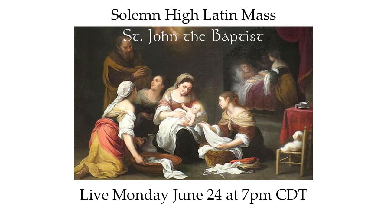 June 24th is the Feast of the Nativity of St. John the Baptist. With “Shawn” being the Irish version of “John,” today is my name day and also the patronal feast of my online apostolate here at ShawnTheBaptist.org. In honor of this greatest of prophets, I will offer a Solemn High Mass in the Extraordinary form at 7:00pm at my parish of St. Michael the Archangel in Leawood, KS. If you can’t be there to attend in person, you can follow the livestream available below and view it after the event.