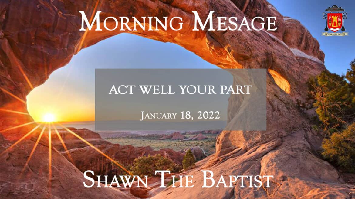 Morning Message Act Well Your Part by Shawn P. Tunink January 18, 2022 by Shawn P. Tunink January 18, 2022 3.6K https://media.blubrry.com/shawnthebaptist/shawnthebaptist.org/audio/morning-message/2022/01/MorningMessage20220118.mp3 God is writing an amazing story and you have been chosen. You get to play a part. https://youtu.be/kKtl1UyiIkE Call from God You may also like Gone to the Mountains March 7, 2022 Caught in the Act March 5, 2022 Hard Times March 4, 2022 Fighting Words March 2, 2022 Farewell, Alleluia March 1, 2022 How Happy Should We Be? February 25, 2022 Apostolic Witness February 23, 2022 Rock of Ages February 22, 2022 Watch That Tongue February 19, 2022 Both / And February 18, 2022